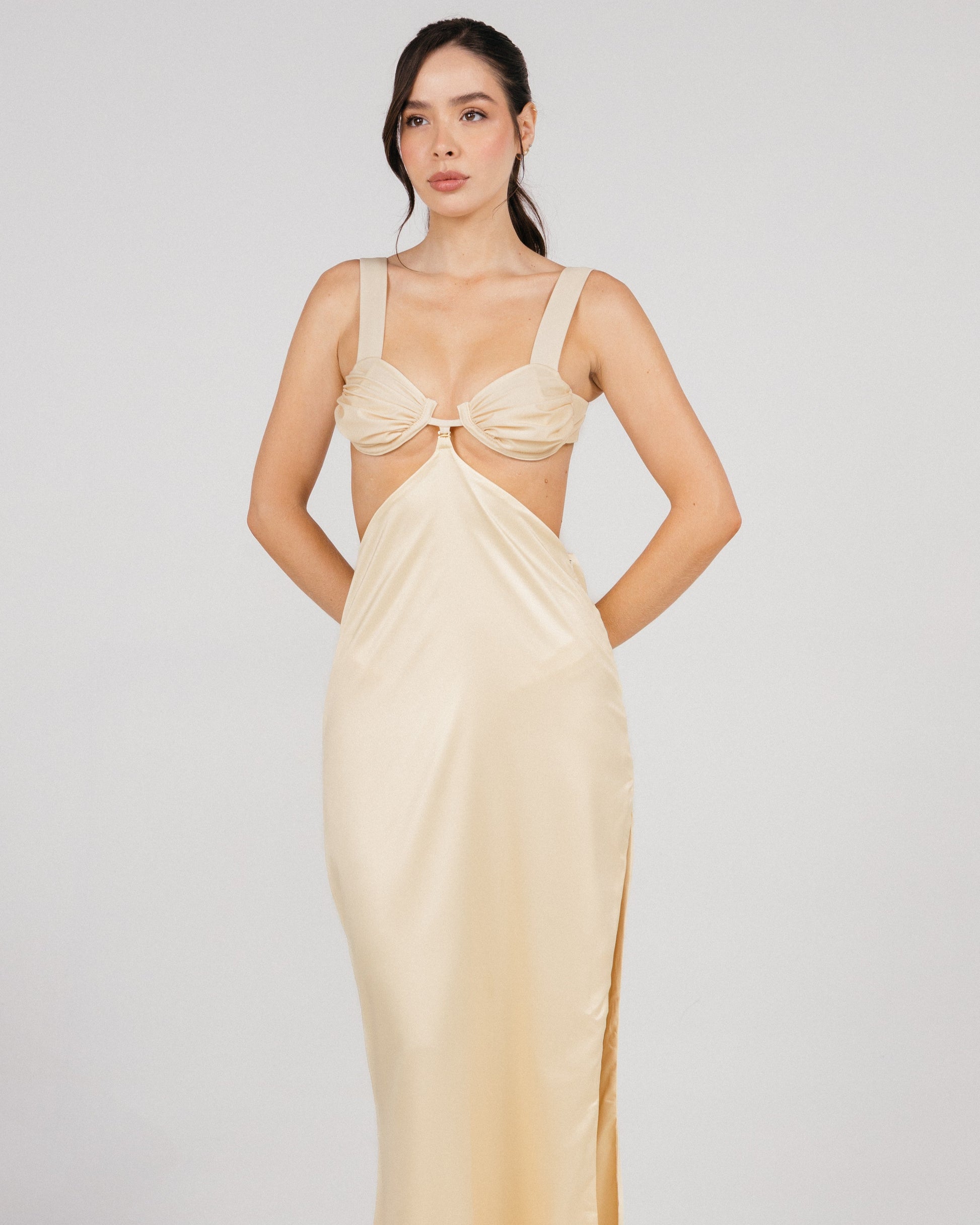 The Zenith Top features structured cups, wide straps, and a chic twist-front detail, offering both support and style. When combined with the detachable, satin-effect skirt in matching butter yellow, you get a two-in-one outfit that radiates versatility and effortless elegance.